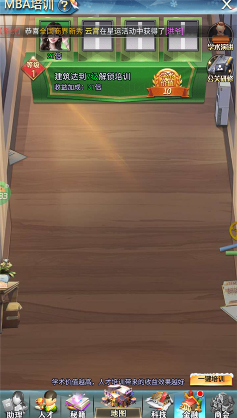 梦幻经理人0.1折是一款拥有超高折扣的模拟经营类手游。玩家将从一个不起眼的小商贩起步,经历艰辛的创业历程,逐渐积累资金,最终迈向商业巅峰。游戏设定在现代商战的背景下,你将管理和扩展自己的产业链,从小摊位做起,一步步收购地块和企业,扩大业务,涉足更多行业,最终成为全球知名的大亨。在梦幻经理人中,玩家不仅需要发展自己的企业,还要注重团队的建设。通过广纳各行各业的优秀人才,你将培养出一支高效的运营团队,提升企业管理水平,稳步推进企业发展。与此同时,你还可以通过阅读经营秘籍,学习并运用高效的商业投资战略,助力企业的成功运营。