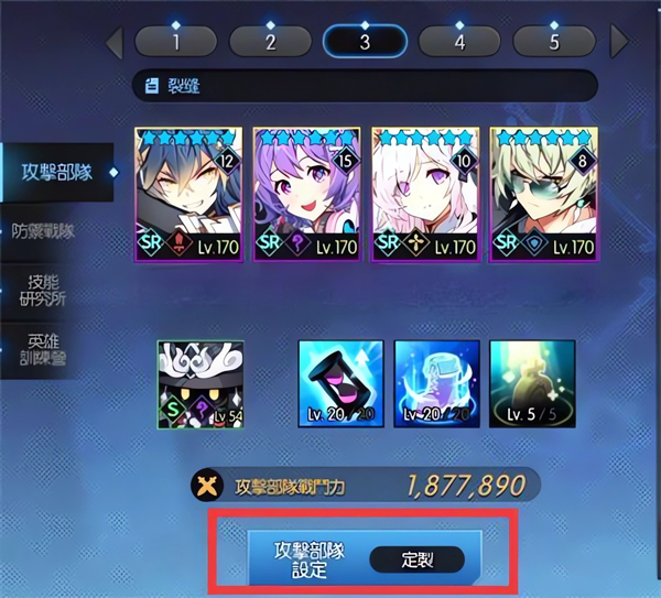 你可以前往主大厅编辑各种队伍配置。通过点击队伍下方的攻击部队设置,进行技能定制,合理安排角色站位,并设置技能使用频率以及自动队伍技能的启动(建议将沙漏放在第一位)。