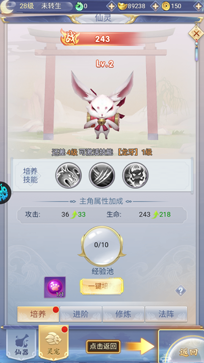 7、玩家闯到第二关boss就可以解锁灵宠培养,其它仙骑、仙翼等到达一定等级即可解锁