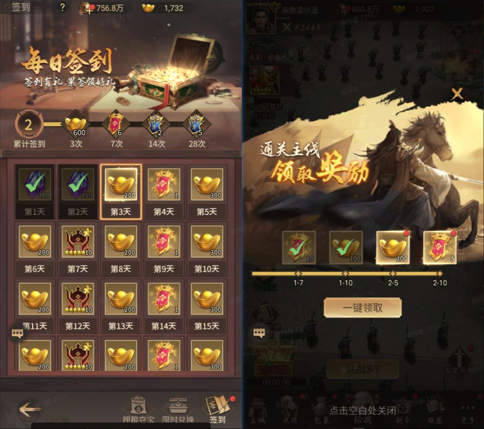 4、每日签到、主线征战获得丰厚元宝道具奖励