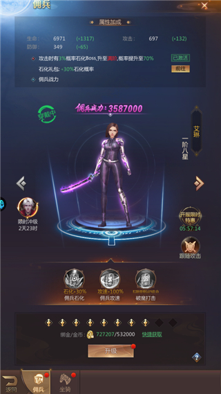 提升佣兵等级,可获得属性提升并获得战斗力。