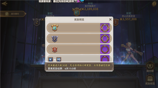 2、竞技场排行:根据玩家在普通竞技场中的积分进行排名。