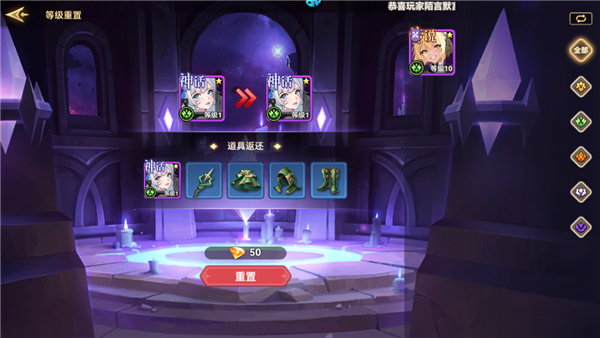 所有已升级的英雄可进行免费重置等级,返还100%升级消耗的材料和穿戴的装备。