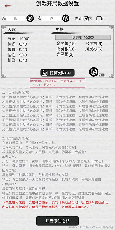 1、初始需要选定代入角色的姓名和性别,也有着固定次数随机出现的灵根和天赋,个人建议出了真灵根就罢手,有好一点的伪灵根也可以将就,不然选到最后剩余的次数是垃圾灵根就需要重开了。