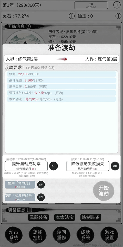 3、经验达到一定层次可以渡劫飞升,达到更高的层次,这里也有着修仙类都具备的炼制丹药和强化经脉内容,较有特点的是自创功法板块,需要游戏里的货币仙玉购买一定数量的功法或者直接用碎片兑换,一键自创就需要筑基境界才能进行。