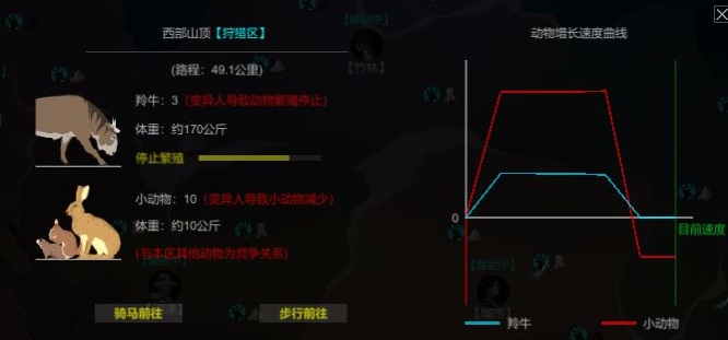 6、荒野生存中可以狩猎,并不意味着你可以肆无忌惮的猎杀动物!保持每个地区动物合理的数量比例,才能够让动物以最快的速度增长,进而提供更多的生存资源!另外,如果某个地区出现变异人或者病毒肆虐,也会影响动物的繁殖!