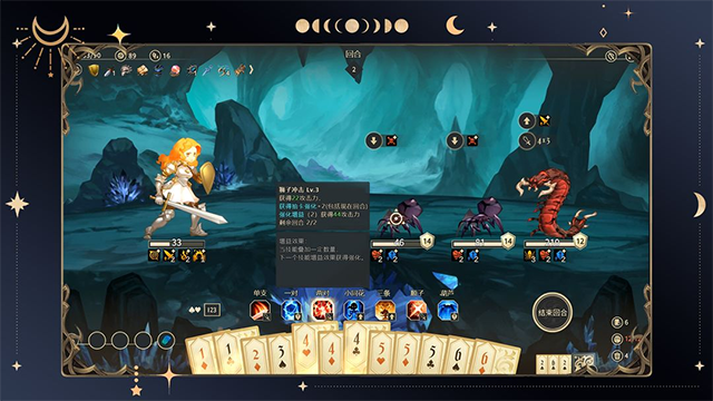 1、在星咏之诗中,你可以利用扑克牌组合出不同的牌型(一对、三条、葫芦…),打出牌型发动技能,攻击敌人或强化自己的能力。