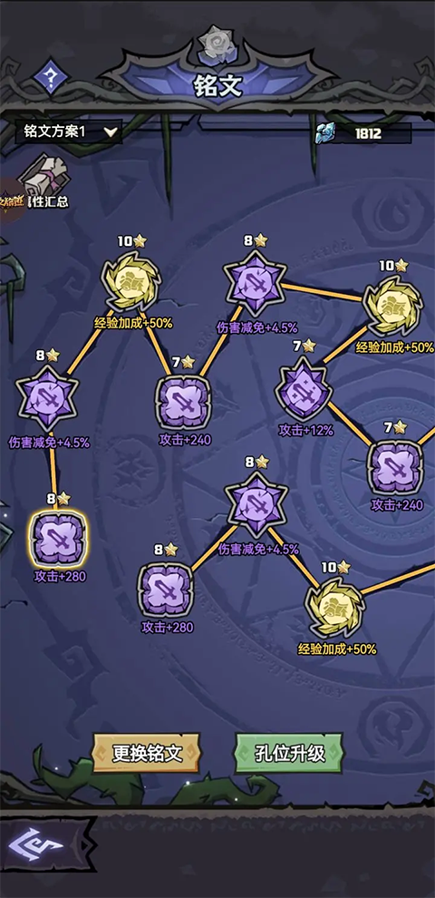 等到解锁铭文后,选择攻击,攻击百分比,减伤(自行更换),和经验加成,一定要先升级经验加成。注意:最下面一排的铭文槽用钻石解锁,有条件要冲榜的一定要先把下面的解锁了。