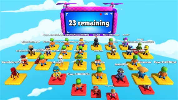 3、当每一个小关卡结束后,所有玩家出现在一个个的小格子中,之后关卡挑战失败的玩家会向下掉落结束游戏。