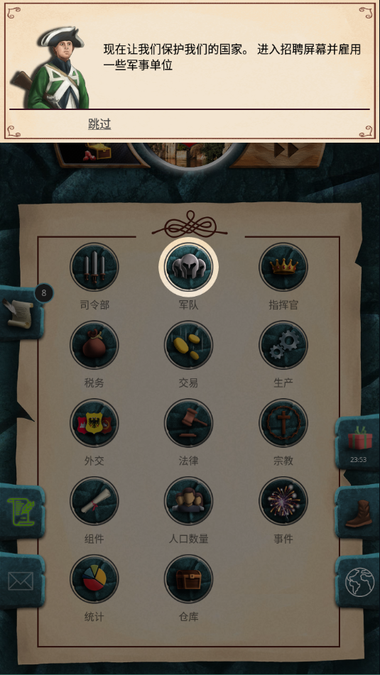 在这里陆军中主要分为指挥人员和军队大楼两大功能:其中指挥人员中可进行攻击国家,间谍布控,破坏和授予独立等要素,且还能进行军事演习,增强国土和士兵强度。