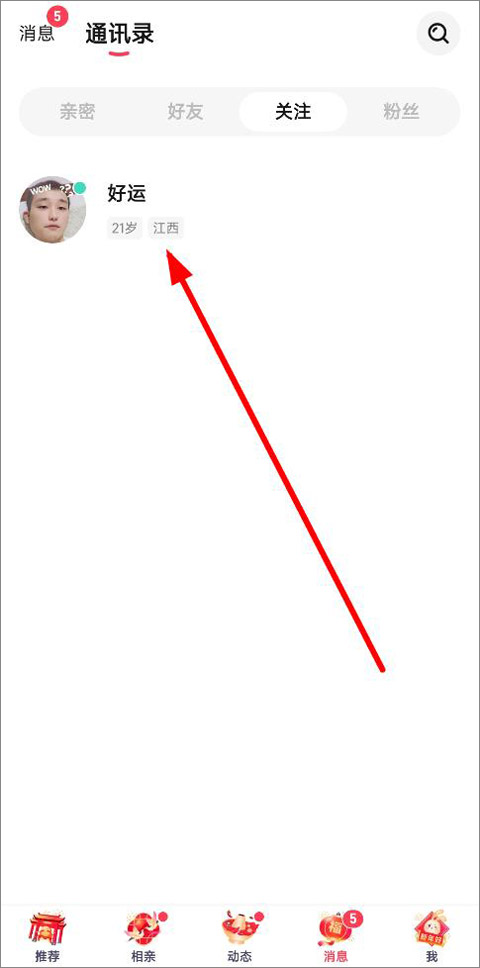 2、通讯录页面可查看关注列表的人,点击关注对象头像;