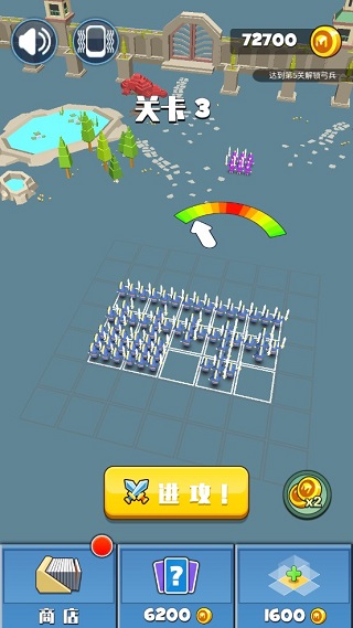 一款玩法简单的模拟战争小游戏。在这款游戏中,你可以自由打造自己的小军队,并按照自己的想法来选择兵种以及排兵布阵来应对不同的敌人。布置完毕后,点击出击,他们就会自己去和敌人的军队打架了。