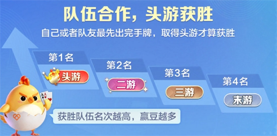 自己或者队友最先出完手牌,取得头游才算获胜,获胜队伍名次越高,赢豆越多