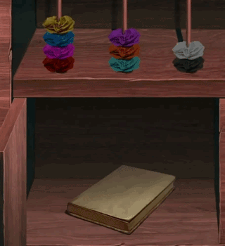 在右边场景进门记住纸灯颜色,点击左边的柜子获得道具,按下图调整纸花位置获得书,记住线索,之后使用按下图解开圆片机关。