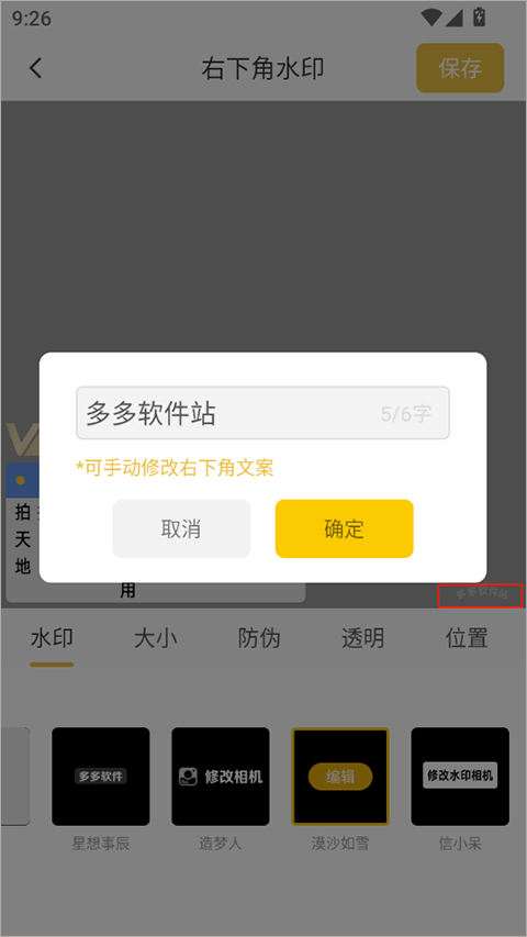支持拍摄和从相册选择照片来添加各种水印,可以改变水印颜色和大小。