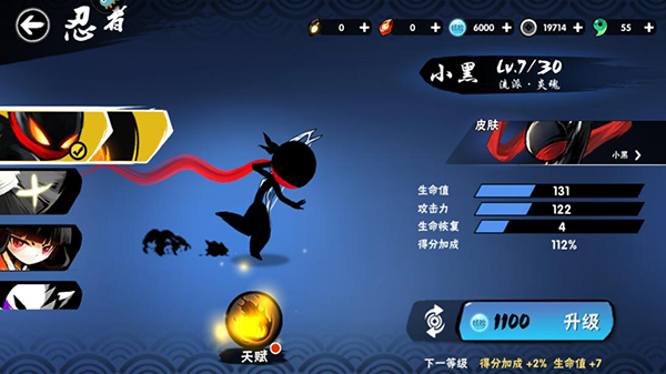 3、使用获取的经验对忍者进行升级就可以提升生命、攻击力等属性了,然后进入到天赋界面,天赋强化后也可以提升战力