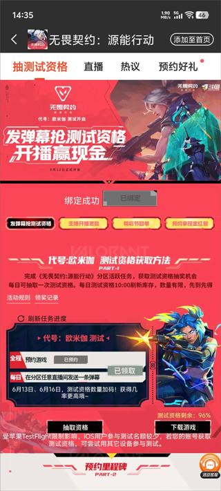 1、打开斗鱼app,进入首页的《无畏契约:源能行动》抽测试资格获得,绑定游戏账号;