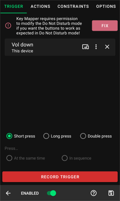 无论哪种情况,第一步都是记录一个触发器。点击红色的“记录触发”按钮,然后按下您想要更改其功能的物理按钮。在本指南中,我将用“降低音量”来演示。