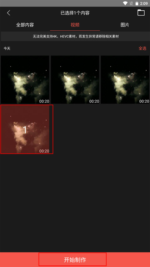 2、在你的相册中导入你要制作的视频素材,选中之后点击下方的开始制作。
