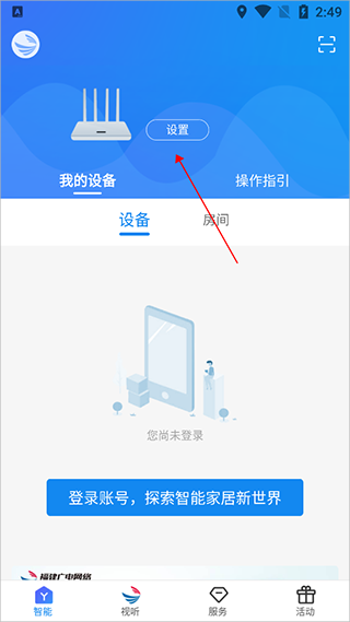 在绑定智能电视前需要用户首先点击应用智能页面中的【设置】进行将手机和投屏设备的网络设置成同一wifi