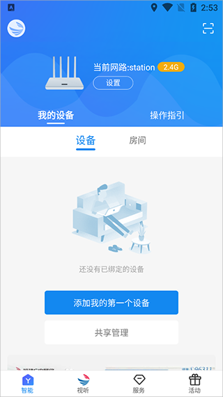 用户首先可以在应用中的操作指引页面中点击爱家监控摄像头宣传图像