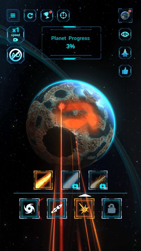 2、进入游戏后,玩法非常简单,玩家需要通过下方的激光以及道具来摧毁星球;