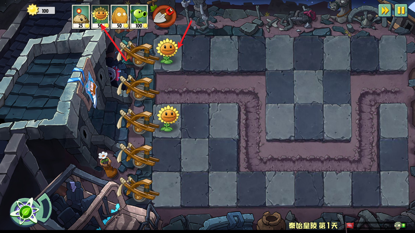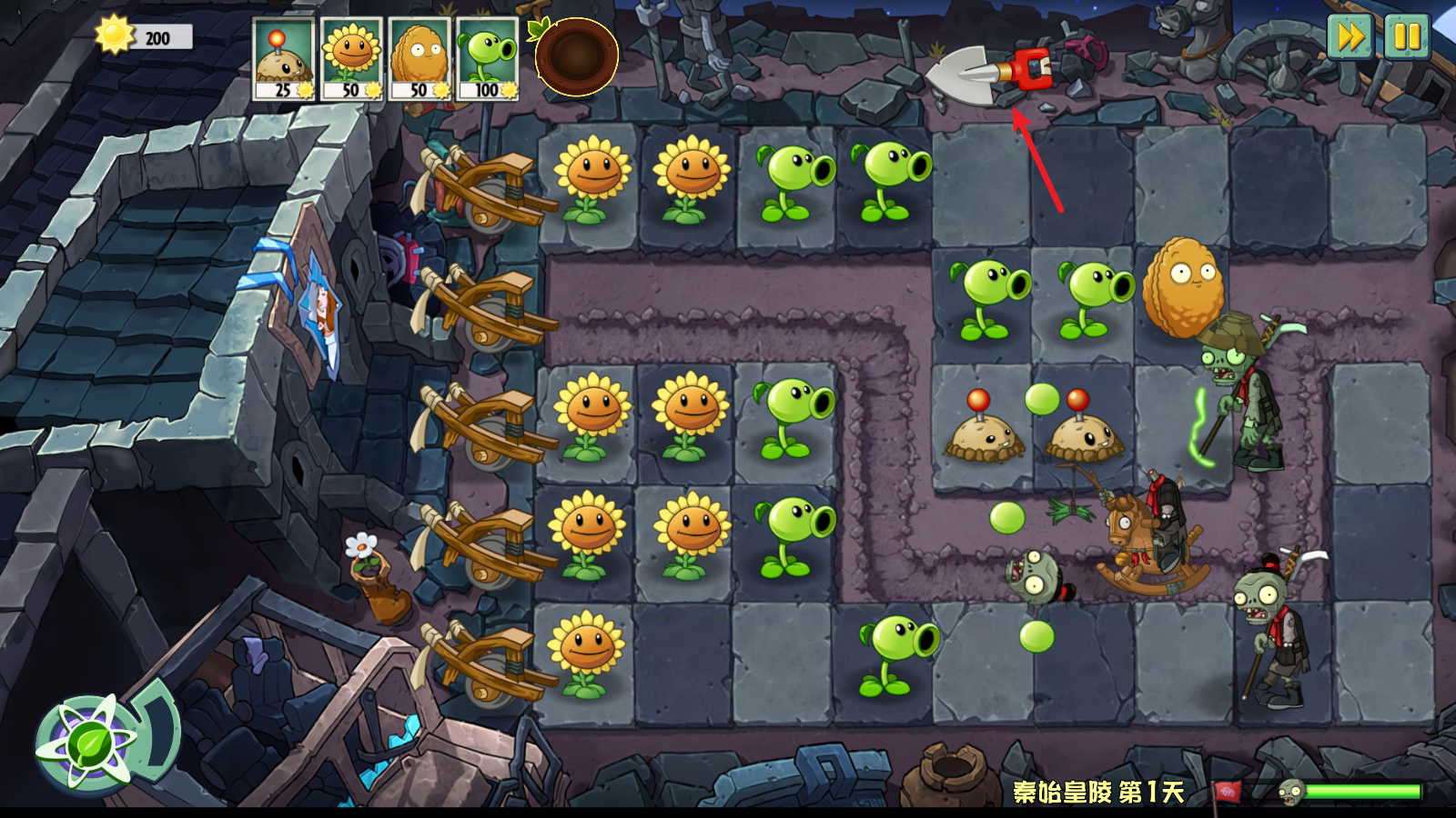 13、当某一路被僵尸突破后会触发保底的小推车,能够消灭这一路的僵尸但是只有一次机会。