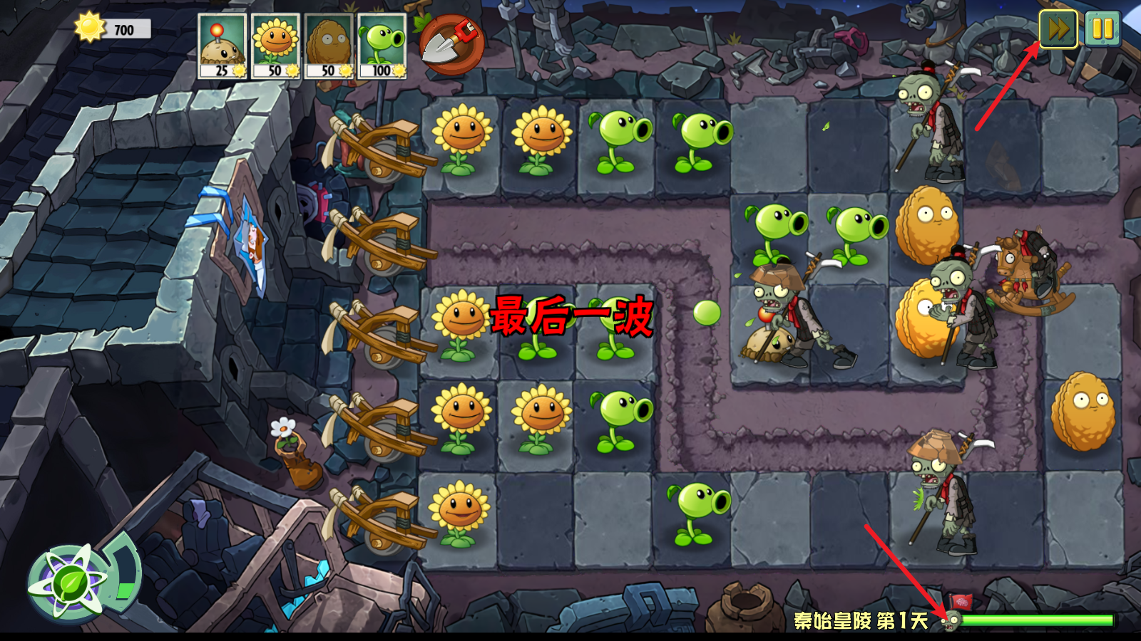 11、点击右上角可以对游戏进行加速,右下角还能够看到僵尸的进攻进度。