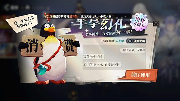 1、开局上线完成新手任务即可享受终身五折优惠。