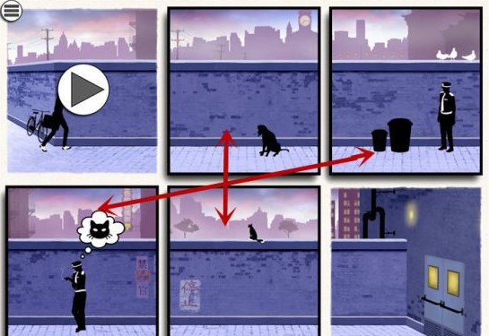 1、一款黑色解谜游戏,玩家可以打破并重构动态漫画框架,改变故事的结局;