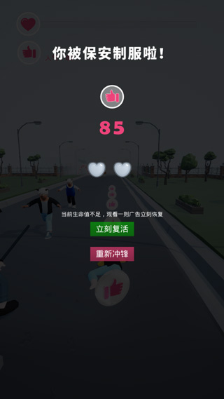 3、如果不小心撞到了障碍物则会被保安抓住,并导致游戏失败;