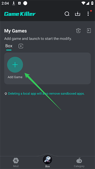 1、打开app后即可即可进入沙箱页面下点击添加游戏的按钮