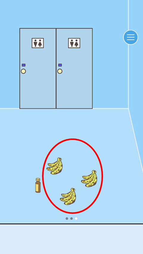 我们先把视角移动到第三场景,通过移动的时候我们发现除了玩家还有三个人而第三个场景有2个卫生间和三个香蕉还有一瓶不知道有什么作用的瓶子,瓶子经小编测试,点击了它就会让人强制加班,所以我们选择掠过这个道具。