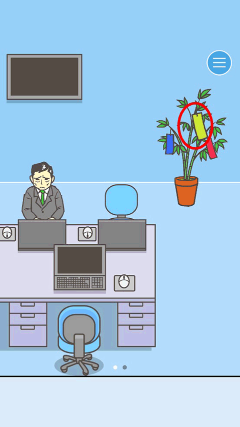 第三关的布局和第一关的布局一模一样,只是我们第一场景多了盆植物以及领导消失了,这个时候如果去第一关的花盆那拿钥匙那是行不通的,而老板也藏匿在那个柜子下面的空间内,这个时候最让人值得怀疑的就是那盆植物,点击植物上的黄色信条就发现钥匙在里面,这个时候直接开门就行了。