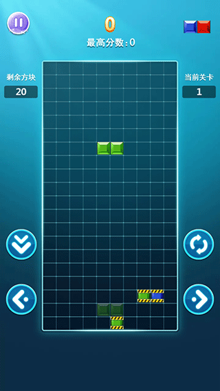 1、下落模式:经典俄罗斯方块玩法,使用宫格旁的键控制罗斯方块的下落,同时消除的行数越多,得分越高;