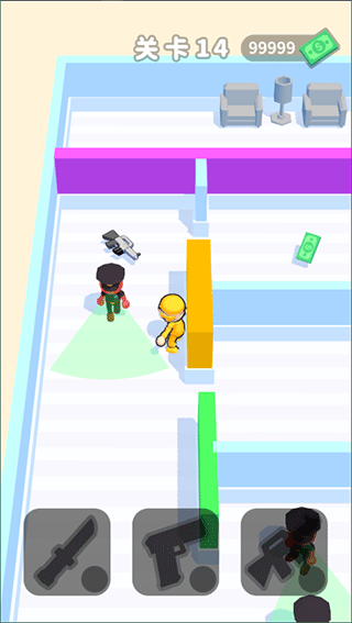 3、游戏开始后,通过移动靠近墙壁或者家具进行伪装,躲避保安的巡查;