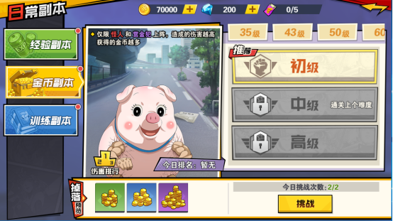 金币副本每天有两次挑战机会,产出嘛自然是金灿灿的金币啦~不过这里小编划个重点,金币副本的挑战只能上阵【怪人】和【赏金犯】角色哦!金币副本根据等级分为多个级别,每个级别下又分为3个难度,每次挑战造成的伤害越高获得的金币也就越多。