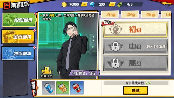 经验副本在26级开放,玩家每天有2次挑战的机会,挑战时只能使用阵营为英雄的角色,副本产出的经验饮料是角色升级不可或缺的道具。经验副本根据等级分为多个级别,每个级别下又分为3个难度,玩家需要通关当前难度才可以解锁后续难度,难度越高获得的奖励也就越好。(如果没有通关副本也不用担心,结束后依然会根据挑战的进度发放奖励哦~)