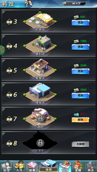 2、收购地块时,谈判战斗需要消耗大量的金钱,人才总能力越高,损耗越低,可以用更少的钱收购。当提示损耗较高时,可以先去提升人才能力,降低损耗。每次谈判还会获得阅历奖励,阅历可用来提升人才等级。每次收购完地块,就可以继续建造建筑,提高赚速了。
