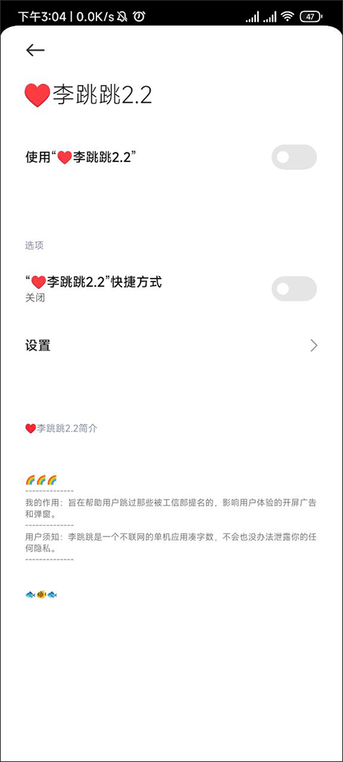 大家在日常使用app的时候是不是经常因为一些广告搞到破防?是不是还因为烦人的开屏广告每次都需要等待几秒钟或者手动跳过而苦恼?今天小编就给大家带来了广告的克星:李跳跳派大星2.6正式版,这是一款免费帮大家跳过广告的超实用工具app,使用了它,现在市面上大多数app的广告我们都可以直接跳过,无论是起点小说、qq音乐,还是知乎、番茄小说的广告都可以自动跳过,提高大家的使用体验,让我们再也不受广告的干扰。