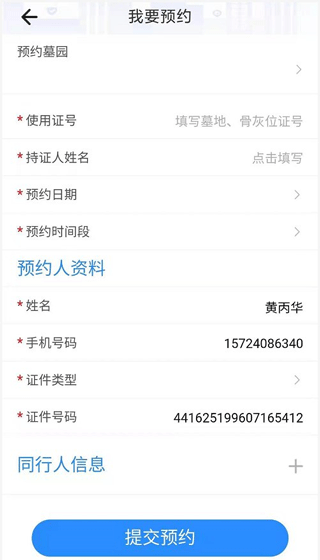 2、预约祭扫-点击“我要预约”按钮即可进入预约信息录入界面,录入信息,点击提交预约即可。