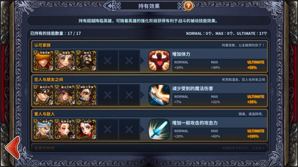 3、除主角外(主角6件),其他角色卡片可穿戴3件装备,主、副手武器和衣服;可强化,强化等级最高为5,需要消耗其他人物卡片,不同颜色的卡片需要的强化值不相同,可合成。