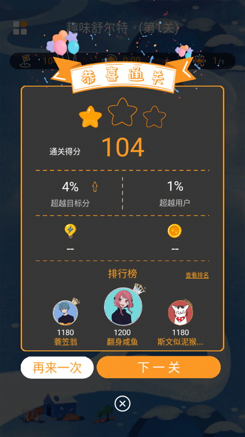 5、当你通关时,页面就会显示你的通关得分、排行榜、超越目标分等各项信息。