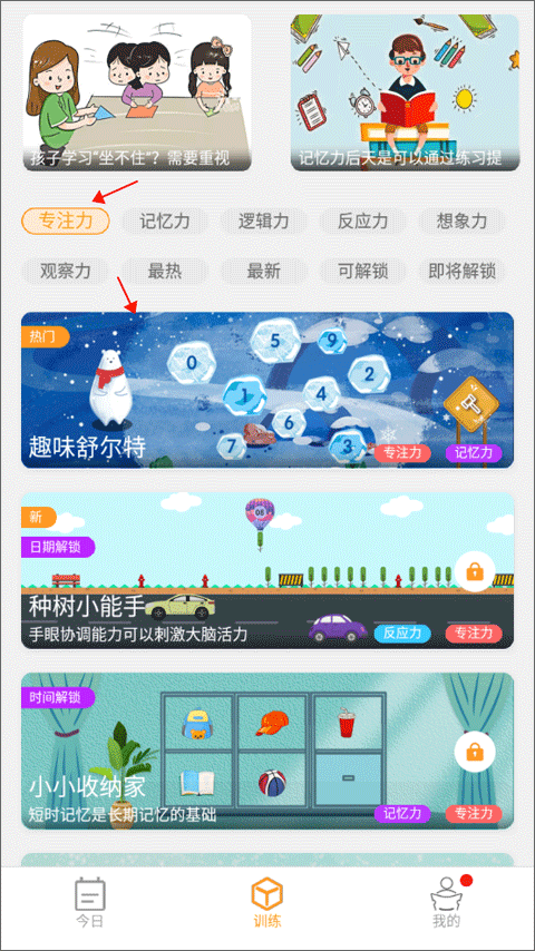 1、打开软件并进入到主界面【今日】,切换到【训练】界面,这里有很多的训练游戏可以锻炼你的专注力、记忆力、逻辑力等,选择专注力这一类的“趣味舒尔特训练”。
