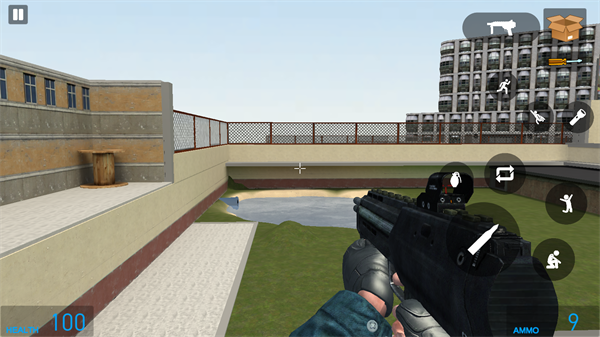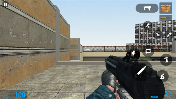 4、游戏左边控制玩家移动,右边控制玩家攻击,跳跃,蹲下,超多的动作,选择屏幕最上方的武器按钮玩家可以自由的选择各种武器,体验丰富的地图。