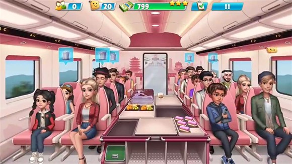 4、点击右侧的箭头可以前往车厢为顾客提供美食,顾客需要的美食会在头顶的气泡上显示。