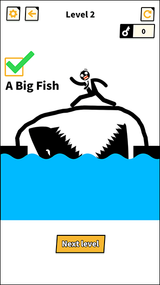 3、进入下一关,我们可以画一条半圆形保护火柴人不被鲨鱼吃掉;