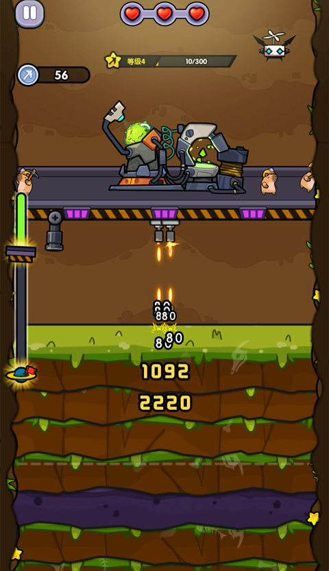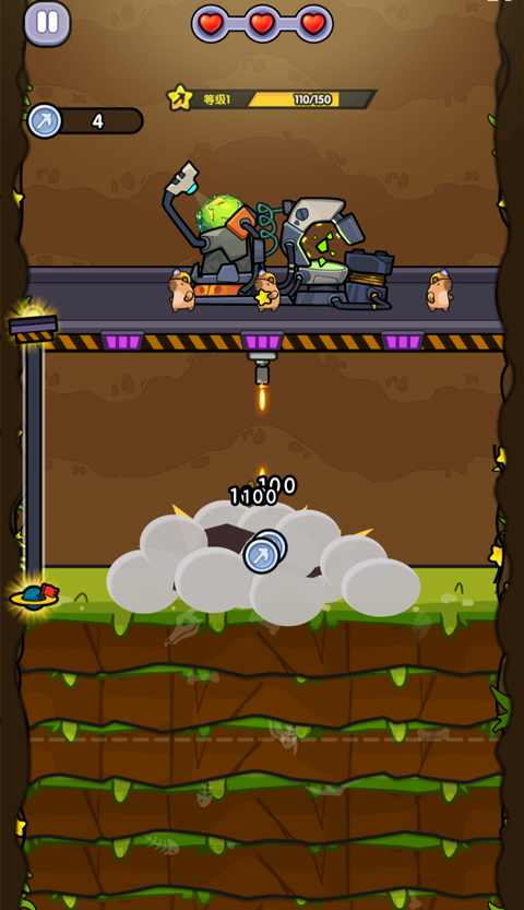 地壳深处埋藏着未知的挑战,玩家将驾驭特制钻探装置展开垂直冒险。单指点击即可完成所有操作—一长按屏幕激活钻头冲击波,短触实现紧急跃迁机动。随着钻头持续向下推进,动态生成的岩层结构会随机出现坚固矿石、高温熔岩带以及沉睡的古代兵器,考验玩家对钻探节奏与地形预判的双重把控。