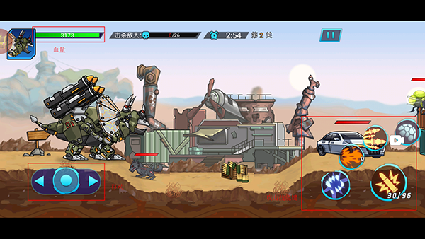 3、左边为移动键,右边是普通射击键和特殊技能键,上方蓝条是血量;