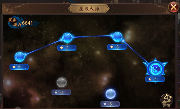 某一星级激活要求即可激活该级星级,获得星级属性,未点亮的星级置灰,左上角为当前星级属性所提供的战力,点击右下角“详情”可查看当前激活的星级大师所有属性的信息。